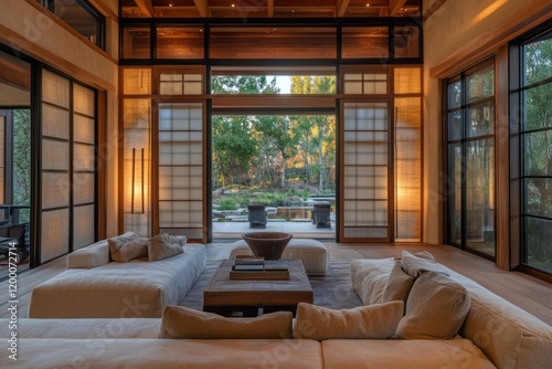 room, living, modern, tranquil, serene, garden, view, window, japanese, sliding, door, shoji, screen, wood, wooden, floor, hardwood, neutral, beige, cushion, pillow, sofa, couch, seating, low, furniture, minimalist, design, interior, style, calm, peaceful, relaxing, comfort, roomy, light, warm, ambient, elegant, sophisticated, contemporary, home