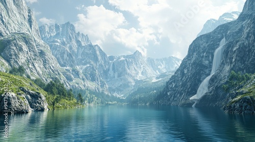 Tranquil Mountain Lake with Waterfall and Snowy Peaks