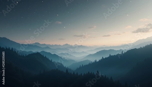 Tranquil Mountain Vista at Dusk, Layers of Peaks and Starry Skies
