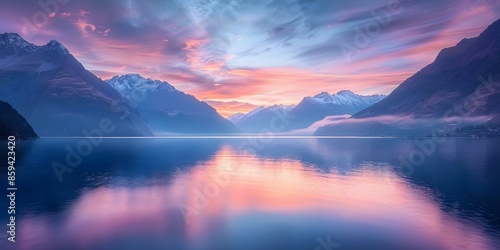 Tranquil New Zealand fjord at dawn with steep cliffs calm water pastel skies. Concept Nature, Travel, New Zealand, Fjord, Sunrise