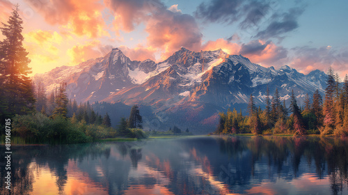 Tranquil Reflections: Mountain Scene at Golden Hour
