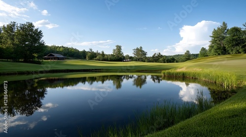 Tranquil Reflections of Greenery on a Golf Course Pond Surrounded by Trees : Generative AI