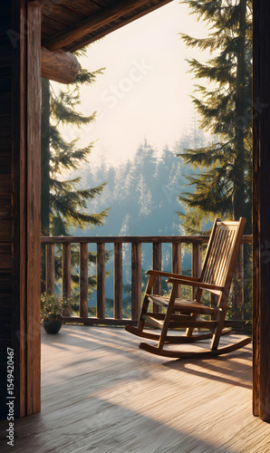 Tranquil retreat a rocking chair on a cabin porch overlooking a serene forest landscape at sunrise creates peaceful ambiance
