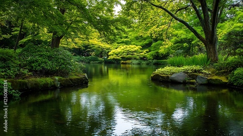 Tranquil Scene of a Lush Japanese Garden with Reflective Water and Green Foliage : Generative AI