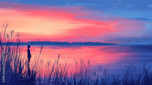 tranquil silhouette near water at sunset, reflecting vibrant colors