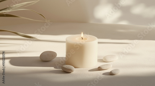 Tranquil Simplicity: White Candle with Stones on a Light Beige Background