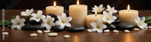 Tranquil spa scene with lit candles, smooth stones, and delicate white flowers on a wooden surface, creating a peaceful and calming ambiance.