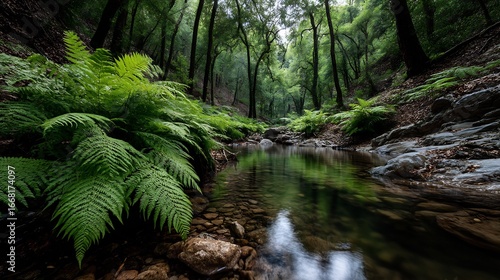 Tranquil Stream Flowing Through a Lush Forest with Ferns: Nature Scene for Backgrounds and Travel Photography