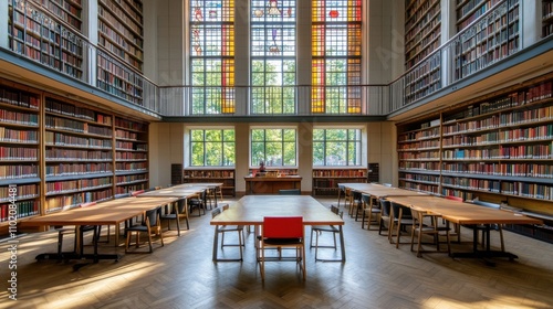 library, reading, study, book, shelf, stained, glasses, window, architecture, indoor, furniture, table, chair, classical, academic, education, peaceful, serene, sunlight, interior, design, university, college, old, historic, learning, cognition, literary, intellectual, focused, contemplative, scholarly, studious, research, reflective, enlightening, tranquil, solace, inspiration, wisdom, literature