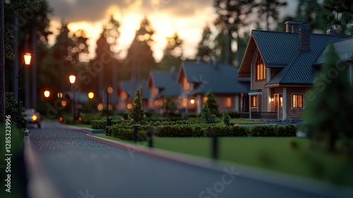 Tranquil suburban neighborhood at sunset, showcasing illuminated homes and serene streets