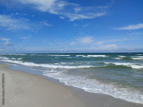 Tranquil Summer Day at Baltic Beach with Gentle Waves Embracing Sandy Shoreline Under Expansive Blue Sky