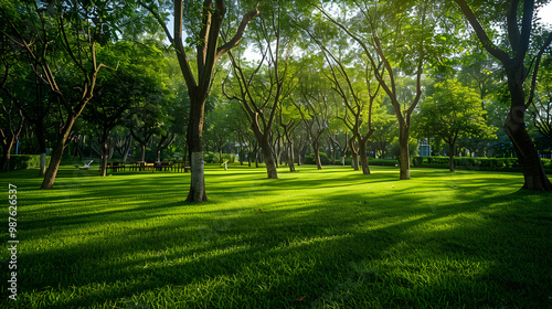 Tranquil Summer Park Lush Green Grass and Sunlight Through Trees