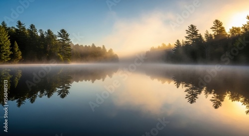 Tranquil sunrise over misty forest lake with reflective waters