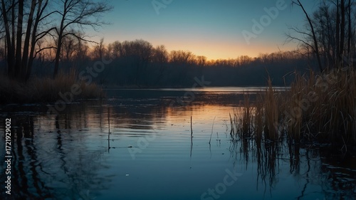 sunset, lake, water, tree, nature, evening, sky, calm, peaceful, tranquil, landscape, dusk, outdoors, scenic, twilight, horizon, orange, blue, forest, wetland, natural, beautiful, view