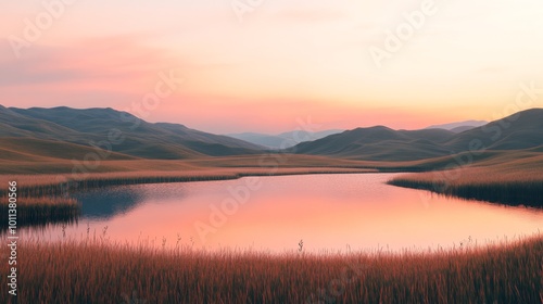 Tranquil Sunset Over a Serene Lake Surrounded by Rolling Hills and Tall Grass in a Peaceful Landscape