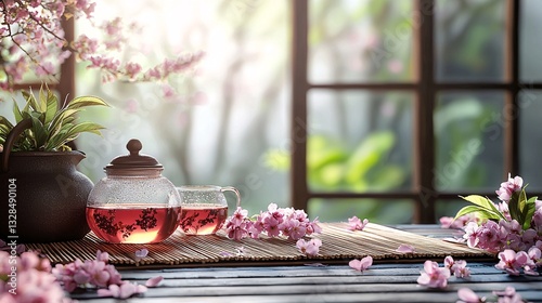 Tranquil Tea Setup with Cherry Blossoms and Natural Light