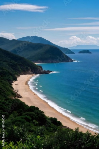 Tranquil Tropical Beach with Turquoise Water Sand and Lush Green Hills in a Sunny Day