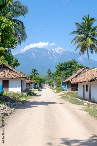 village, street, road, house, palm tree, mountain, sky, blue, white, tropical, rural, rustic, nature, vacation, travel, scenic, tour tourism, beauty, landscape, traveler, destination, adventure, peace, calmness, quiet, charming, historic, culture, traditional, architecture, photo, photo, summer, holiday, beautiful, amazing, stunning, gorgeous, peaceful, sun, light, shadow, dirt, explore