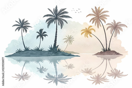 palm, tree, tropical, island, ocean, water, sunset, silhouette, watercolor, landscape, beach, calm, serene, peaceful, tranquil, relaxing, nature, summer, vacation, travel, paradise, tree, painting, scenic, idylli, get-away, escape, rest, to rest, blue, teal, beige, brown, grey, pastel, soft, colours, muted, tone, artistic, design, art, image, photo, visual, graphic