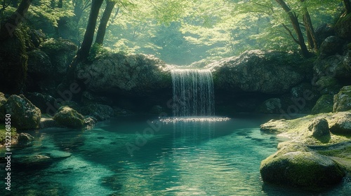 waterfall, pool, forest, lush, tranquil, crystal, clear, water, rock, moss, tree, sunlight, calm, nature, serenity, green, blue, stone, flowing, misty, hidden, fresh, peaceful, glistening, emerald, shadow, landscape, wood, stream, gentle, duck pond, quiet, scenic, picturesque, healing, magic, wonder, wilderness, beauty