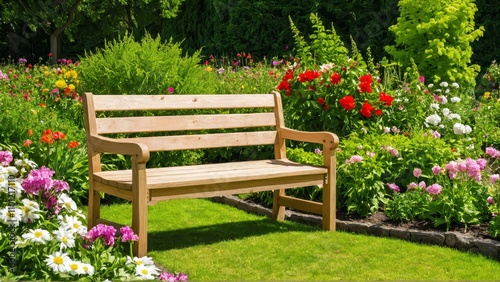Tranquil wooden bench amidst colorful summer garden blooms
