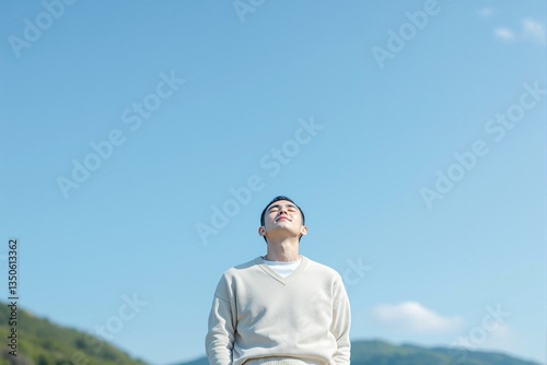 man, sky, peaceful, creative, nature, meditation, freedom, relaxation, mountain, happiness, fresh, air, mindfulness, calmness, calm, serenity, thinking, inspiration, positive, wellness, sunny, clear, blue, background, breathing, stress, relief, energy, lifestyle, refreshing, optimistic, solitude, harmony, contemplation, balance, perspective, hopeful, comfort, dream, motivation, enjoying, young, sweater, bright, ai, generative, illustration
