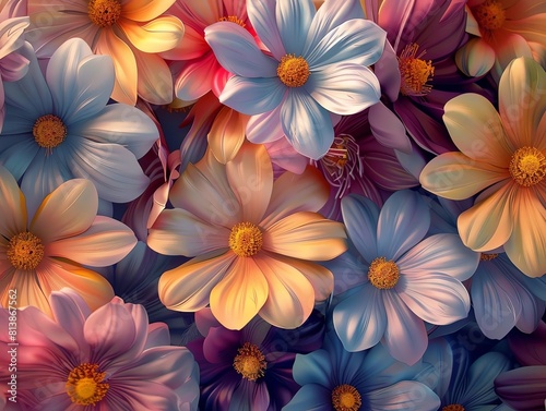 Transform the worms-eye view of blooming flowers into a digital masterpiece Employ CG 3D techniques to enhance the vibrancy and colors