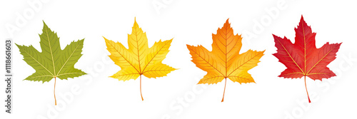 Translucent PNG Image of Four Maple Leaves in Autumn Colors: Green, Yellow, Orange, and Red - Perfect for Seasonal Design Projects