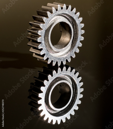 transmission parts from a race motorcycle engine on a reflective background