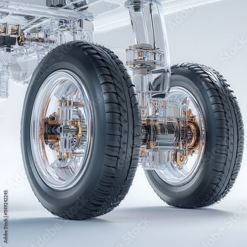Transparent 3D Render of a Car's Wheel Assembly, Showing Intricate Internal Mechanics and Black Tire Tread Detail.