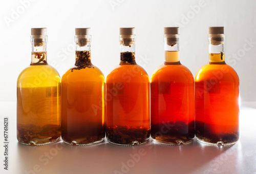Transparent bottles with brown alcoholic drink on a white background. The concept of homemade herbal tinctures from moonshine. Homemade cognac and brandy.