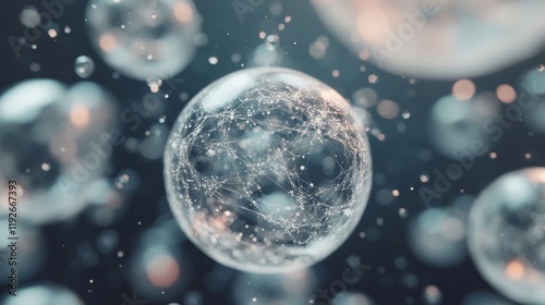 Transparent cells are depicted with intricate patterns and structures, creating a mesmerizing display against a dark background