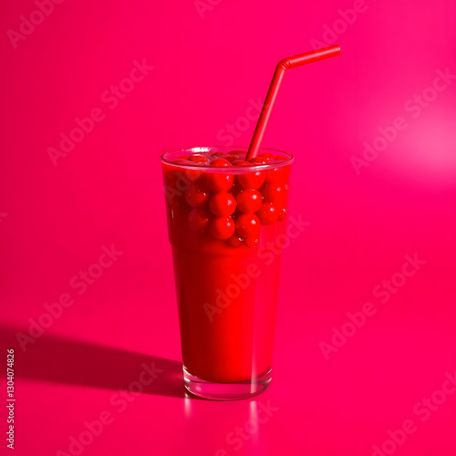Transparent Cup with Luscious Red Drink, Floating Fruit Beads, Matching Red Lid & Straw, Set Against Bold Monochromatic Red Background with Glossy Reflections for a Refreshing, Tantalizing Look