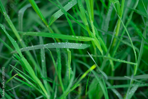 transparent drops of morning dew on the green grass close up