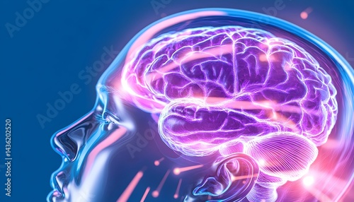 Transparent head showcasing a vibrant, active brain with glowing neural pathways