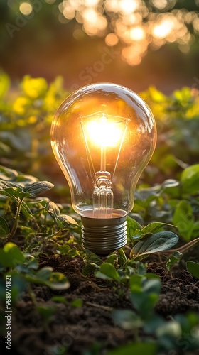 Transparent light bulb, glowing with sunlight, suspended above fertile farmland, blending innovation with natural growth, clean energy concept