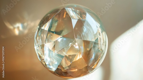 Transparent sphere with floating geometric shapes inside, casting soft reflections and a festive shimmer.