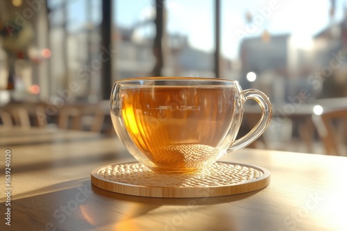 Transparent teacup with warm beverage on a wooden coaster.