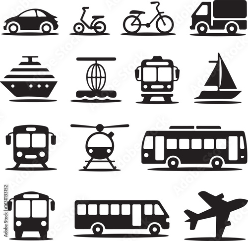 transportation, vehicle, icon, silhouette, graphic, design, vector, black-and-white, car, automobile, bicycle, motorcycle, scooter, truck, bus, helicopter, sailboat, ship, cruise ship, aeroplane, transport, travel, mobility, commute, journey