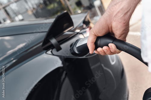 Transportation. Young man traveling by electric car stop at chraging station holding charger close-up
