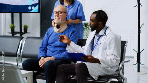 treatment, senior, reception, neck, medicals, medic, injury, hospital, health care, foam, exam, doctor, patient, accident, appointment, diverse, cervical, collar, diagnosis, african american, caucasian, asian, elderly, adult, consultation, disease, braces, support, recovery, pain, injured, medication, physical, medicine, physician, nurse, form, fracture, waiting room, lobby, woman, man, disease, medicare, general practitioner