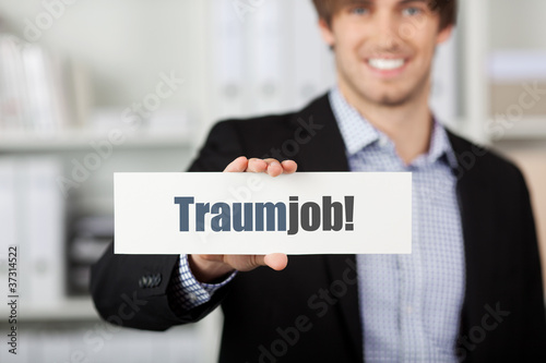 dream, job, plate, point, man, hand, holding, job market, quest, work, workplace, career, success, successful, display, want ad, offering, find, person, man, smiling, smile, text, word, vision, happiness, contented