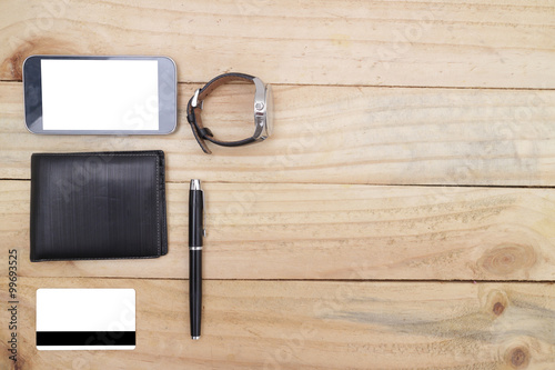 Travel arrangement of wallet with credit card , passports, compass on wood table background. Travel concept.