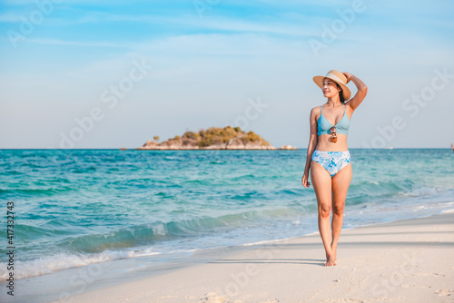 Travel asian woman summertime relax on beach at day in Thailand summer season