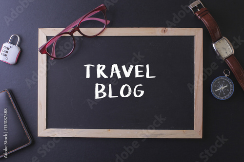 TRAVEL BLOG WORD ON BLACKBOARD WITH WATCH,PASPORT, GLASS AND LOC