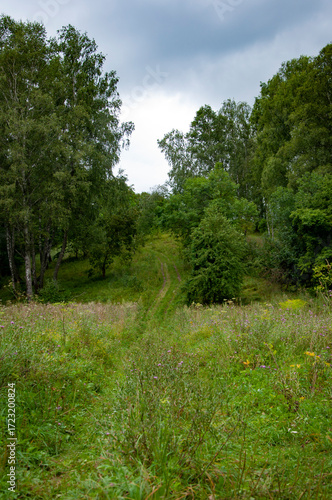 Travel destination. Touristic trail of empty road pathway in forest or park with green lush nature landscape. Landscape with forest. Forest nature. Nature in mountain countryside
