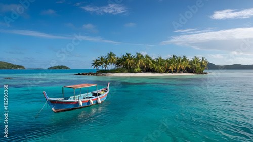 Travel exploration budget relaxation concept. A vibrant boat floats in crystal-clear turquoise waters near a lush, tropical island under a bright blue sky.