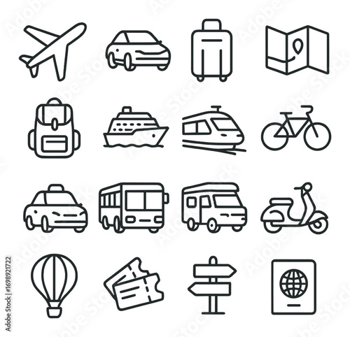 travel, transportation, linear, icon, set, aeroplane, car, baggage, map, backpack, ship, train, bicycle, taxi, passport, scooter, bus, recreational vehicles, balloon, ticket, signpost, journey, vehicle, aerodrome, tour tourism, exploration, adventure, trip, navigation, destination, holiday, vacation, route, road, rail, flight, maritime, cycling, transit, backpacking, commuting, touring, itinerary, discovery, travelog, voyage, excursion