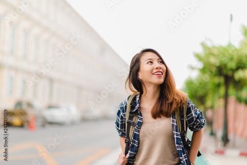 Traveler backpacker asian woman travel in Bangkok, Thailand. Happy young female spending holiday trip at amazing landmark and enjoy her journey in traditional city.