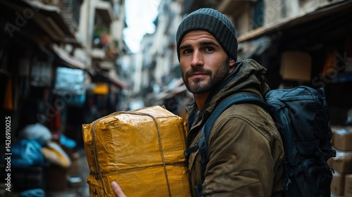 Traveler carrying a package in a city